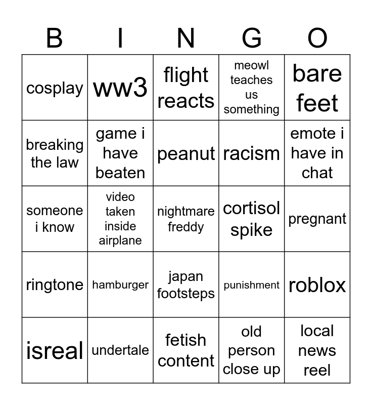 This bingo card has a free space and 24 words: hamburger, undertale, peanut, isreal, bare feet, cosplay, breaking the law, ww3, cortisol spike, japan footsteps, racism, someone i know, punishment, roblox, game i have beaten, old person close up, pregnant, flight reacts, emote i have in chat, video taken inside airplane, local news reel, ringtone, meowl teaches us something and fetish content.