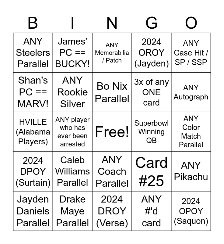 This bingo card has a free space and 24 words: Caleb Williams Parallel, Drake Maye Parallel, Bo Nix Parallel, Jayden Daniels Parallel, ANY Case Hit / SP / SSP, ANY Steelers Parallel, Shan's PC == MARV!, James' PC == BUCKY!, Superbowl Winning QB, ANY Coach Parallel, 3x of any ONE card, HVILLE (Alabama Players), Card #25, ANY Pikachu, ANY Rookie Silver, ANY #'d card, ANY Color Match Parallel, ANY Memorabilia / Patch, ANY Autograph, ANY player who has ever been arrested, 2024 OPOY (Saquon), 2024 DPOY (Surtain), 2024 OROY (Jayden) and 2024 DROY (Verse).
