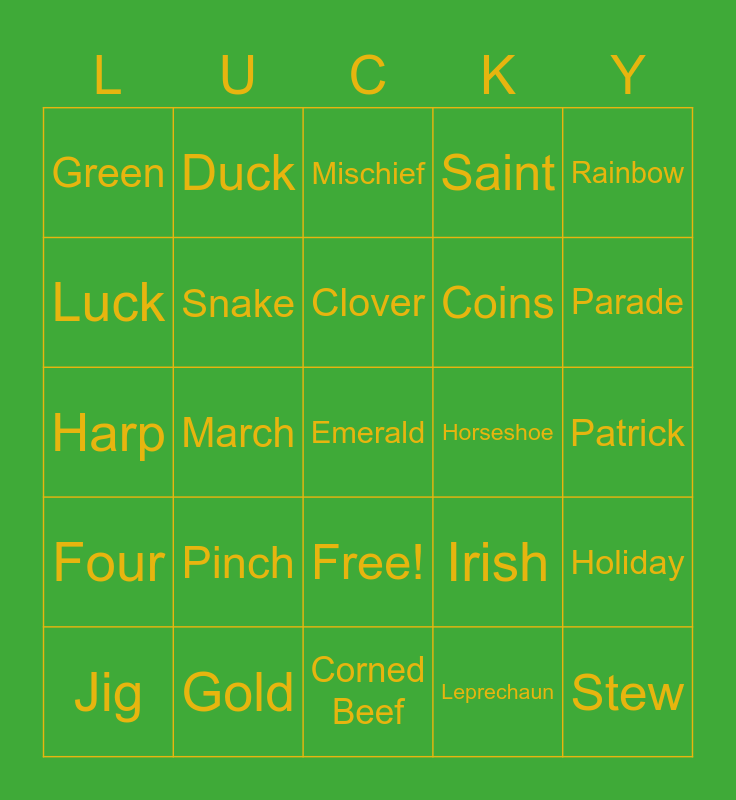This bingo card has 26 words: Free!, Leprechaun, Clover, Gold, Rainbow, Green, Luck, Duck, Patrick, Irish, Coins, Harp, Holiday, Jig, March, Shamrock, Saint, Four, Mischief, Emerald, Parade, Corned Beef, Horseshoe, Pinch, Snake and Stew.