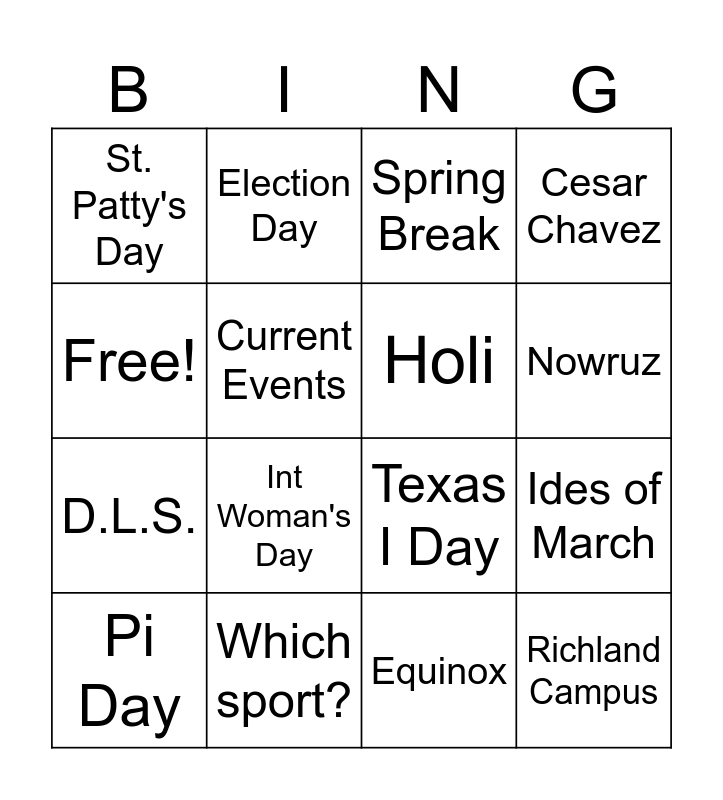 This bingo card has 16 words: Which sport?, Ides of March, Spring Break, St. Patty's Day, D.L.S., Election Day, Texas I Day, Equinox, Free!, Current Events, Pi Day, Cesar Chavez, Int Woman's Day, Nowruz, Holi and Richland Campus.