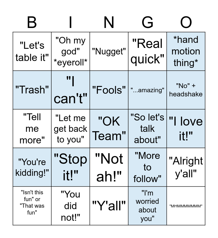 This bingo card has 25 words: "Stop it!", "Y'all", "Fools", "Isn't this fun" or "That was fun", *hand motion thing*, "Let's table it", "Trash", "Oh my god" *eyeroll*, "So let's talk about", "Not ah!", "...amazing", "Tell me more", "More to follow", "Alright y'all", "I can't", "MHMMMMMMM", "I love it!", "Nugget", "No" + headshake, "Let me get back to you", "OK Team", "You did not!", "You're kidding!", "Real quick" and "I'm worried about you".