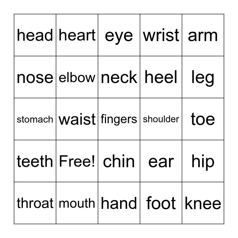This bingo card has 25 words: Free!, hand, neck, throat, arm, head, nose, heart, shoulder, chin, heel, stomach, ear, hip, elbow, knee, toe, eye, leg, waist, fingers, mouth, teeth, wrist and foot.