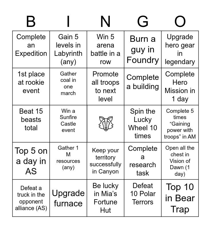 This bingo card has a free space and 24 words: Gather 1 M resources (any), Upgrade furnace, Promote all troops to next level, Defeat a truck in the opponent alliance (AS), Upgrade hero gear in legendary, Complete an Expedition, 1st place at rookie event, Gain 5 levels in Labyrinth (any), Spin the Lucky Wheel 10 times, Keep your territory successfully in Canyon, Complete a building, Beat 15 beasts total, Complete a research task, Open all the chest in Vision of Dawn (1 day), Gather coal in one march, Defeat 10 Polar Terrors, Complete 5 times “Gaining power with troops” in AM, Win 5 arena battle in a row, Complete Hero Mission in 1 day, Win a Sunfire Castle event, Top 10 in Bear Trap, Top 5 on a day in AS, Burn a guy in Foundry and Be lucky in Mia’s Fortune Hut.