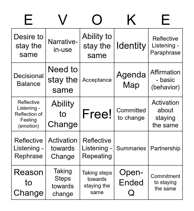 This bingo card has a free space and 29 words: Reason to Change, Desire to Change, Ability to Change, Need to Change, Desire to stay the same, Ability to stay the same, Need to stay the same, Activation towards Change, Committed to change, Taking Steps towards change, Activation about staying the same, Commitment to staying the same, Taking steps towards staying the same, Open-Ended Q, Affirmation - basic (behavior), Affirmation - advanced (values), Reflective Listening - Repeating, Reflective Listening - Rephrase, Reflective Listening - Paraphrase, Reflective Listening - Reflection of Feeling (emotion), Summaries, Scaling Q, Agenda Map, Decisional Balance, Identity, Narrative-in-use, Partnership, Acceptance and Compassion.