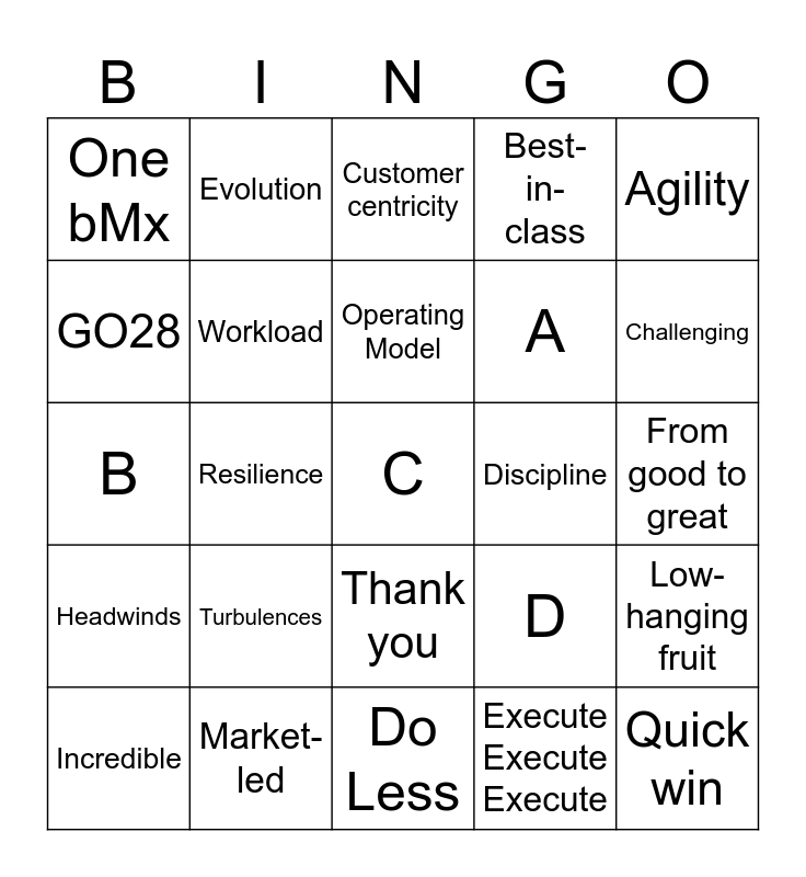 This bingo card has a free space and 24 words: Turbulences, Market-led, Operating Model, Incredible, Agility, One bMx, GO28, Evolution, Discipline, Thank you, A, B, D, Low-hanging fruit, Workload, Execute Execute Execute, From good to great, Customer centricity, Challenging, Resilience, Quick win, Headwinds, Best-in-class and Do Less.
