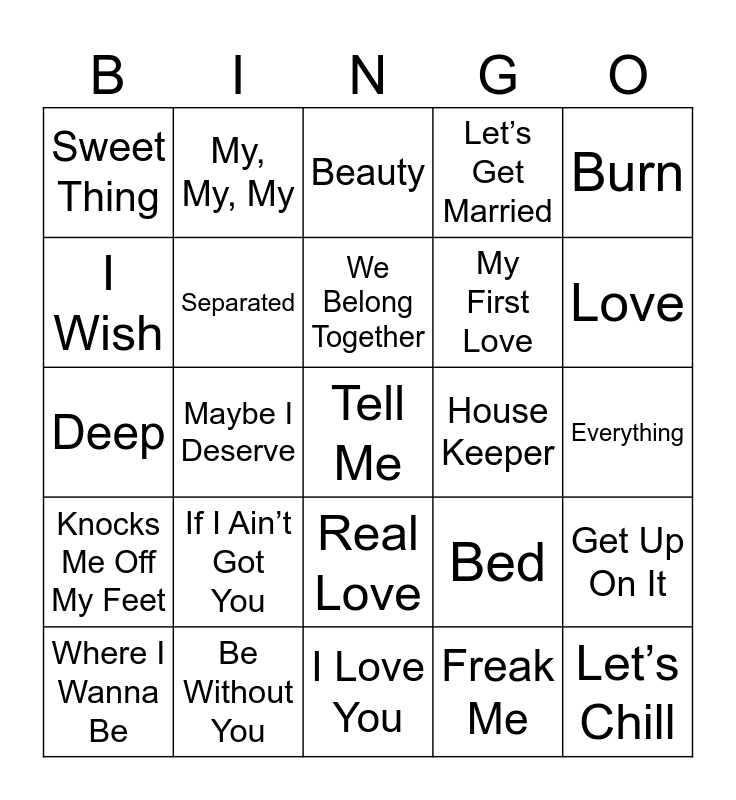 This bingo card has 33 words: Let’s Chill, Nice & Slow, Maybe I Deserve, U Got It Bad, Knocks Me Off My Feet, Separated, Burn, Where I Wanna Be, My, My, My, Confessions Part II, We Belong Together, Beauty, Nobody’s Supposed to Be Here, John Doe, House Keeper, Love, Be Without You, Deep, If I Ain’t Got You, Bed, Real Love, Don’t Leave Me, Sweet Thing, Everything, I Love You, Tell Me, Let’s Get Married, My First Love, I Wish, Get Up On It, Feenin’, Freak Me and Nobody.