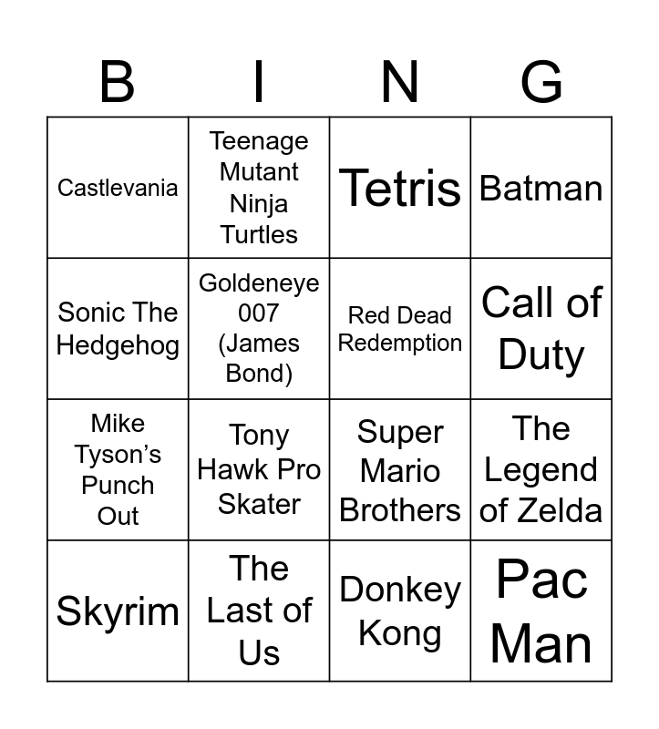 This bingo card has 19 words: Super Mario Brothers, Mega Man, Tetris, Pac Man, The Legend of Zelda, Sonic The Hedgehog, Donkey Kong, Castlevania, Teenage Mutant Ninja Turtles, Mike Tyson’s Punch Out, Tony Hawk Pro Skater, Goldeneye 007 (James Bond), Red Dead Redemption, The Last of Us, Skyrim, Madden, Batman, Call of Duty and Frogger.