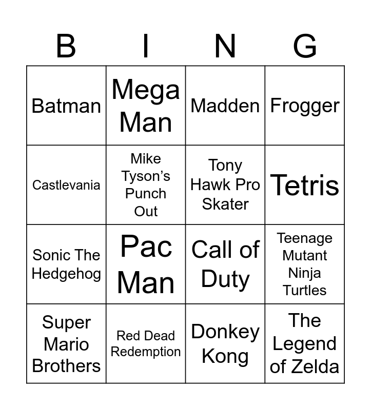 This bingo card has 18 words: Pac Man, The Legend of Zelda, Madden, Batman, Call of Duty, Frogger, Super Mario Brothers, Mega Man, Tetris, Sonic The Hedgehog, Donkey Kong, Castlevania, Teenage Mutant Ninja Turtles, Mike Tyson’s Punch Out, Tony Hawk Pro Skater, Goldeneye 007 (James Bond), Red Dead Redemption and The Last of Us.