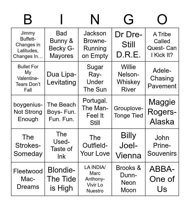 This bingo card has 25 words: The Used- Taste of Ink, LA INDIA/ Marc Anthony- Vivir Lo Nuestro, Sugar Ray- Under The Sun, Fleetwood Mac- Dreams, A Tribe Called Quest- Can I Kick It?, Jimmy Buffett- Changes in Latitudes, Changes In…, Bullet For My Valentine- Tears Don’t Fall, Bad Bunny & Becky G- Mayores, Grouplove- Tonge Tied, The Outfield- Your Love, Willie Nelson- Whiskey River, boygenius- Not Strong Enough, Billy Joel- Vienna, John Prine- Souvenirs, Dua Lipa- Levitating, ABBA- One of Us, Maggie Rogers- Alaska, Jackson Browne- Running on Empty, Adele- Chasing Pavement, The Beach Boys- Fun. Fun. Fun., Portugal. The Man- Feel It Still, Blondie- The Tide is High, The Strokes- Someday, Dr Dre- Still D.R.E. and Brooks & Dunn- Neon Moon.