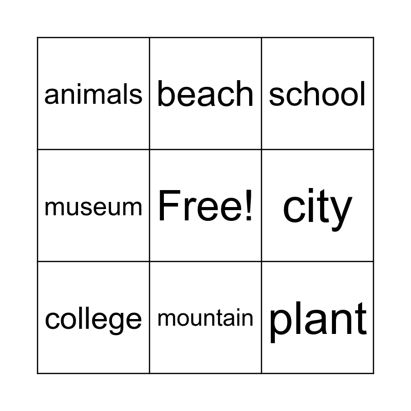 This bingo card has a free space and 26 words: forest, waterfall, mountain, tree, plant, animals, city, beach, lake, grass, snow, desert, island, ocean, hospital, hotel, museum, restaurant, school, store, cafe, zoo, park, mall, college and cinema.