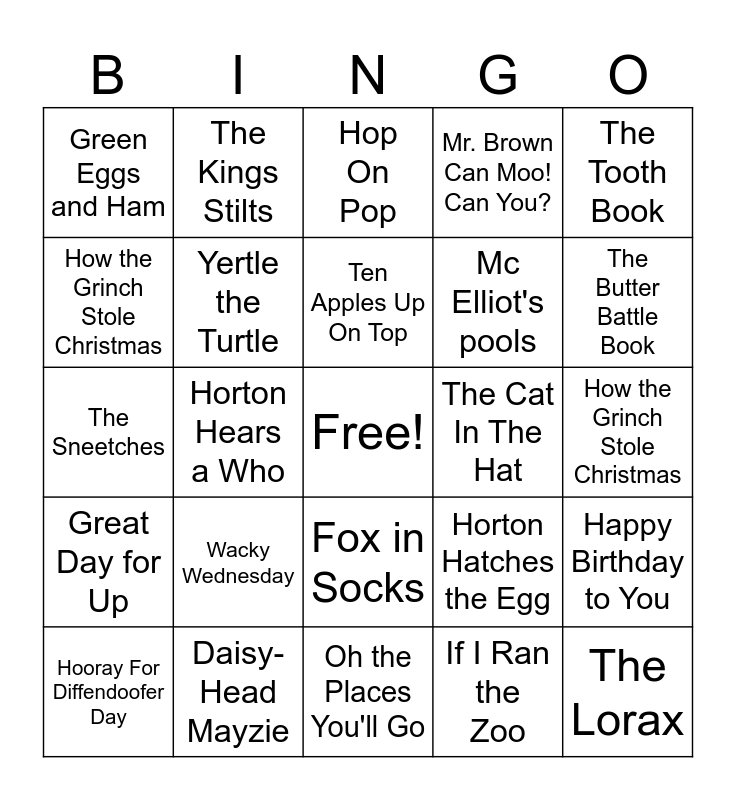 This bingo card has a free space and 24 words: Wacky Wednesday, Daisy-Head Mayzie, Ten Apples Up On Top, Hooray For Diffendoofer Day, The Tooth Book, Green Eggs and Ham, How the Grinch Stole Christmas, The Kings Stilts, The Cat In The Hat, Fox in Socks, Mc Elliot's pools, The Sneetches, Horton Hatches the Egg, Happy Birthday to You, Yertle the Turtle, If I Ran the Zoo, How the Grinch Stole Christmas, Hop On Pop, The Butter Battle Book, Horton Hears a Who, The Lorax, Great Day for Up, Mr. Brown Can Moo! Can You? and Oh the Places You'll Go.