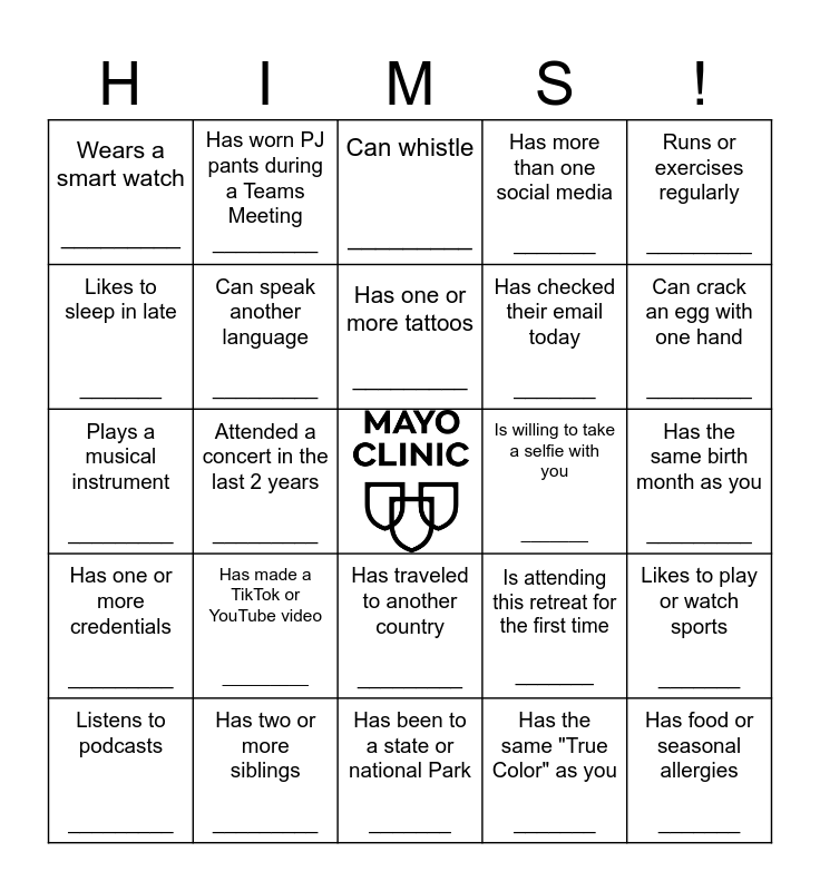 This bingo card has a free space and 33 words: Likes spicy food _________, Has broken a bone __________, Attended a concert in the last 2 years _________, Has one or more pets at home _________, Has one or more credentials _________, Can speak another language _________, Runs or exercises regularly _________, Listens to podcasts _________, Has worn PJ pants during a Teams Meeting _________, Traveled via plane to get here _________, Has one or more tattoos _________, Can whistle _________, Likes to read or listen to audiobooks ________, Wears glasses or contacts ________, Is willing to take a selfie with you _______, Can crack an egg with one hand _________, Has two or more siblings _________, Plays a musical instrument _________, Has made a TikTok or YouTube video _________, Is attending this retreat for the first time _______, Has traveled to another country _________, Has worked at Mayo Clinic for more than 5 years _________, Wears a smart watch _________, Has the same birth month as you _________, Has been to a state or national Park _______, Has food or seasonal allergies _______, Has more than one social media _______, Has checked their email today _______, Likes to sleep in late _______, Likes to play or watch sports _______, Is wearing the same color clothing as you _________, Has the same "True Color" as you _______ and Works in a different Service Line than you _______.