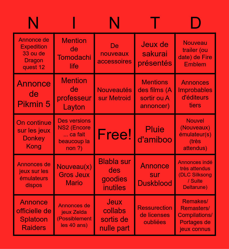 This bingo card has a free space and 24 words: Nouveau(x) Gros Jeux Mario, Annonces de jeux Zelda (Possiblement les 40 ans), Nouveautés sur Metroid, Annonce officielle de Splatoon Raiders, Nouveau trailer (ou date) de Fire Emblem, Annonce de Expedition 33 ou de Dragon quest 12, Annonce de Pikmin 5, Mention de Tomodachi life, Pluie d'amiboo, Blabla sur des goodies inutiles, Mentions des films (A sortir ou A annoncer), On continue sur les jeux Donkey Kong, Annonce sur Duskblood, Annonces indé très attendus (DLC Silksong / Suite Deltarune), Mention de professeur Layton, Ressurection de licenses oubliées, Nouvel (Nouveaux) émulateur(s) (très attendus), De nouveaux accessoires, Annonces Improbables d'éditeurs tiers, Des versions NS2 (Encore ... ca fait beaucoup la non ?), Remakes/ Remasters/ Compilations/ Portages de jeux connus, Annonces de jeux sur les émulateurs dispos, Jeux de sakurai présentés and Jeux collabs sortis de nulle part.