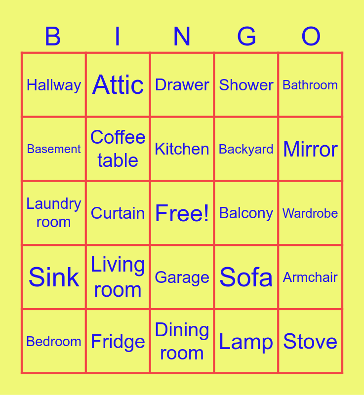 This bingo card has a free space and 25 words: Living room, Dining room, Kitchen, Bedroom, Bathroom, Hallway, Basement, Attic, Balcony, Garage, Backyard, Laundry room, Sofa, Armchair, Coffee table, Bookshelf, Wardrobe, Drawer, Mirror, Curtain, Stove, Fridge, Sink, Shower and Lamp.