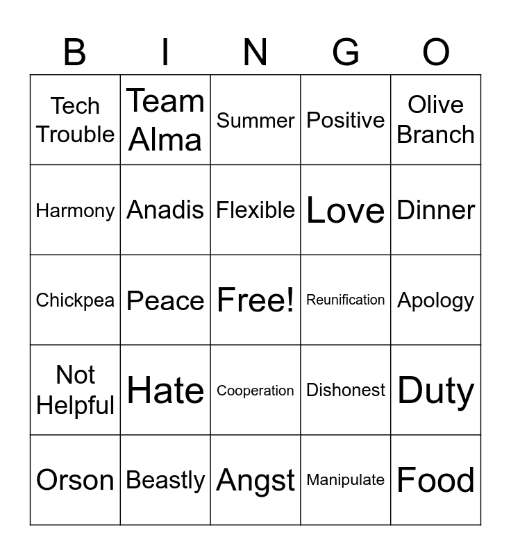 This bingo card has a free space and 65 words: Rude, Mom, Hope, Duty, Activity, Responsibility, Team Alma, Custody Battle, Flexible, 6/8, Cooperation, Rebellion, Apology, Olive Branch, Respect, Harmony, Peace, Tech Trouble, Choose Battle, Love, Hate, Not Helpful, Positive, Happy, Travel, Argument, Teenager, Court Order, Food, David, Orson, Authority, Compromise, TikTok, Dishonest, Beastly, Harangue, Chickpea, Manipulate, Gaslighting, Anadis, Patient, Reunification, Resonable, unfair/unequal, unkind, Dinner, iPhone 16, Hank, Schedule, Quality time, Bunkbed, Transition, Angst, Pills, Give & Take, Contempt, Summer, Holiday, Parent, Honor, Disrespect, Kindness, Walk and Lunch.