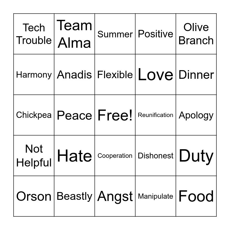 This bingo card has a free space and 65 words: Rude, Mom, Hope, Duty, Activity, Responsibility, Team Alma, Custody Battle, Flexible, 6/8, Cooperation, Rebellion, Apology, Olive Branch, Respect, Harmony, Peace, Tech Trouble, Choose Battle, Love, Hate, Not Helpful, Positive, Happy, Travel, Argument, Teenager, Court Order, Food, David, Orson, Authority, Compromise, TikTok, Dishonest, Beastly, Harangue, Chickpea, Manipulate, Gaslighting, Anadis, Patient, Reunification, Resonable, unfair/unequal, unkind, Dinner, iPhone 16, Hank, Schedule, Quality time, Bunkbed, Transition, Angst, Pills, Give & Take, Contempt, Summer, Holiday, Parent, Honor, Disrespect, Kindness, Walk and Lunch.
