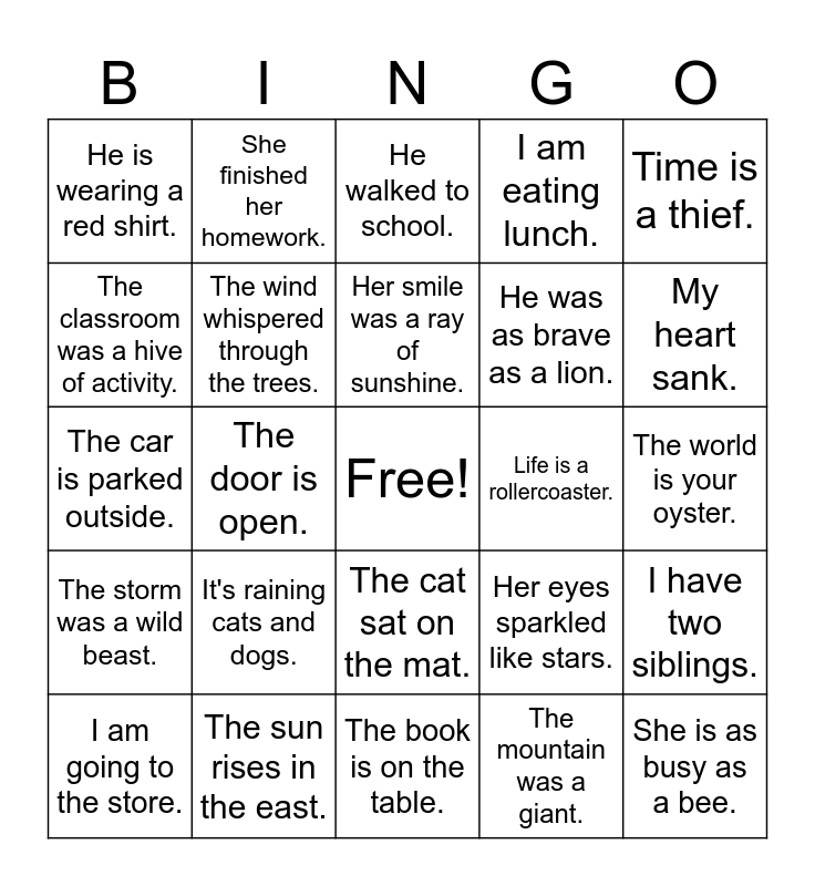 This bingo card has a free space and 25 words: It's raining cats and dogs., The book is on the table., Her smile was a ray of sunshine., I am going to the store., Time is a thief., He is wearing a red shirt., The classroom was a hive of activity., She finished her homework., Life is a rollercoaster., The cat sat on the mat., He was as brave as a lion., The car is parked outside., Her eyes sparkled like stars., I have two siblings., The wind whispered through the trees., It is 5 PM., The world is your oyster., He walked to school., My heart sank., The door is open., She is as busy as a bee., The sun rises in the east., The storm was a wild beast., I am eating lunch. and The mountain was a giant..
