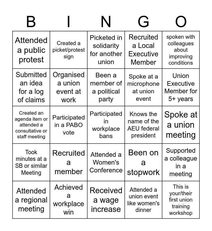 This bingo card has a free space and 24 words: Attended a regional meeting, Recruited a member, Been a member of a political party, Attended a union event like women's dinner, spoken with colleagues about improving conditions, Attended a public protest, Created a picket/protest sign, Picketed in solidarity for another union, Knows the name of the AEU federal president, Spoke at a union meeting, Created an agenda item or attended a consultative or staff meeting, Organised a union event at work, Been on a stopwork, Supported a colleague in a meeting, Submitted an idea for a log of claims, Achieved a workplace win, Received a wage increase, Recruited a Local Executive Member, Union Executive Member for 5+ years, Took minutes at a SB or similar Meeting, Participated in a PABO vote, Attended a Women's Conference, Spoke at a microphone at union event and This is your/their first union training workshop.