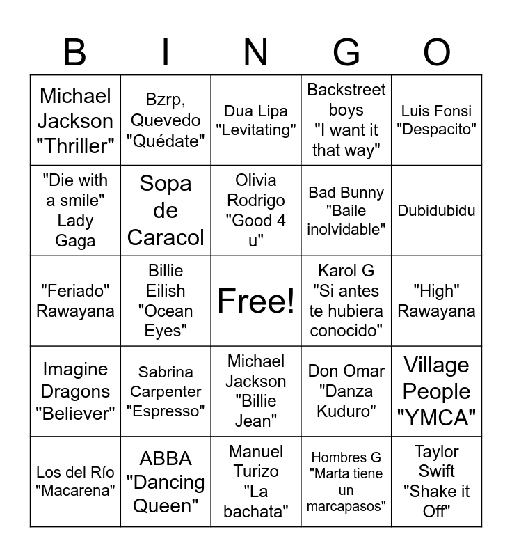 This bingo card has a free space and 24 words: Los del Río "Macarena", Sabrina Carpenter "Espresso", Olivia Rodrigo "Good 4 u", Hombres G "Marta tiene un marcapasos", Luis Fonsi "Despacito", Michael Jackson "Thriller", Bzrp, Quevedo "Quédate", Dua Lipa "Levitating", Karol G "Si antes te hubiera conocido", "High" Rawayana, "Feriado" Rawayana, Sopa de Caracol, Don Omar "Danza Kuduro", Village People "YMCA", "Die with a smile" Lady Gaga, ABBA "Dancing Queen", Manuel Turizo "La bachata", Backstreet boys "I want it that way", Dubidubidu, Imagine Dragons "Believer", Billie Eilish "Ocean Eyes", Michael Jackson "Billie Jean", Bad Bunny "Baile inolvidable" and Taylor Swift "Shake it Off".