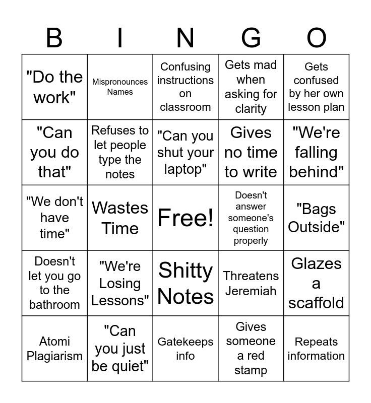 This bingo card has a free space and 24 words: "We're Losing Lessons", "Can you just be quiet", "Can you shut your laptop", Atomi Plagiarism, Gets confused by her own lesson plan, "Do the work", "Can you do that", Mispronounces Names, Doesn't answer someone's question properly, Shitty Notes, Gives no time to write, "We don't have time", Threatens Jeremiah, Glazes a scaffold, Refuses to let people type the notes, Gives someone a red stamp, "Bags Outside", Confusing instructions on classroom, "We're falling behind", Wastes Time, Repeats information, Doesn't let you go to the bathroom, Gets mad when asking for clarity and Gatekeeps info.