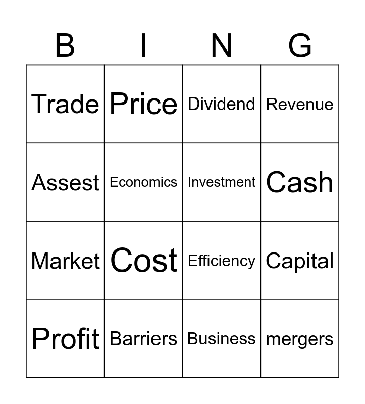 This bingo card has 16 words: Barriers, Capital, Dividend, Trade, Market, Price, Efficiency, Business, Assest, Economics, Profit, Revenue, Cost, Cash, Investment and mergers.