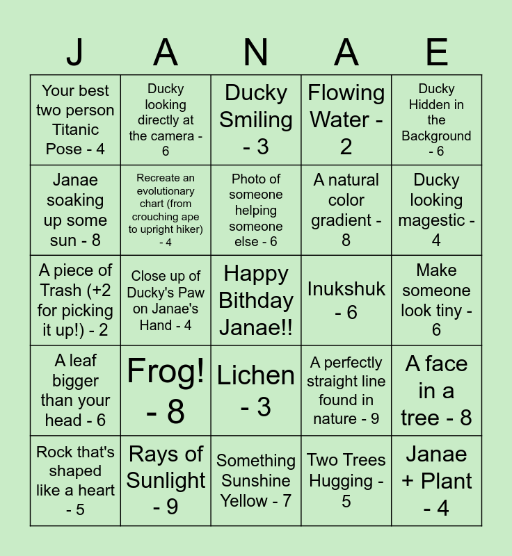This bingo card has a free space and 45 words: Candid of Janae Laughing - 6, Janae + Plant - 4, Group selfie, (nobody looking at camera +3) - 3, Rock that's shaped like a heart - 5, Exactly 28 of something - 7, Two Trees Hugging - 5, Ducky Smiling - 3, Bird! (+3 if Janae can't identify it) - 5, Ducky Hidden in the Background - 6, Rays of Sunlight - 9, Flowing Water - 2, Inukshuk - 6, Lichen - 3, Frog! - 8, Holding Hands ❤️ - 5, Something Sunshine Yellow - 7, A little Home - 8, A piece of Trash (+2 for picking it up!) - 2, Candid of Janae looking into Nature - 4, Ducky looking magestic - 4, Ducky looking directly at the camera - 6, Janae wearing someone elses Jacket or Hat (No repeats!) - 3, Ducky being carried like a baby - 4, Your best two person Titanic Pose - 4, A wizard staff! - 3, Make someone look tiny - 6, A perfect relection in water - 8, Three different Types of moss in one photo - 4, A perfectly straight line found in nature - 9, A leaf bigger than your head - 6, Something naturally blue (No trash or clothing) - 8, A face in a tree - 8, Spell a 4 letter word with only things from the ground - 6, Make a tiny puddle look like a massive lake - 7, an artsy "Frame within a frame" photo - 7, Close up of Ducky's Paw on Janae's Hand - 4, Janae lost in her element - 10, A genuine laugh - 10, Ducky giving someone a kiss - 5, Photo of someone helping someone else - 6, Janae soaking up some sun - 8, A natural color gradient - 8, A plant or flower that is growing out of a stump - 5, Recreate an evolutionary chart (from crouching ape to upright hiker) - 4 and Someone proposing to a tree or a really nice rock. - 2.