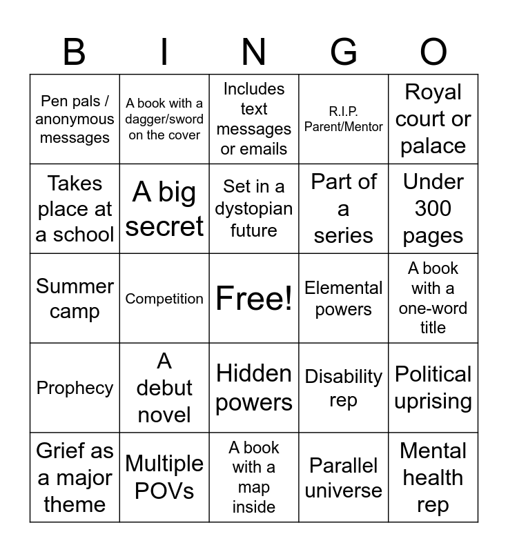 This bingo card has a free space and 35 words: A chosen one, Love triangle, Found family, A big secret, Hidden powers, R.I.P. Parent/Mentor, Takes place at a school, Road trip story, Set in a dystopian future, Small town setting, Summer camp, Royal court or palace, Takes place over one school year, First love, Pen pals / anonymous messages, Elemental powers, Parallel universe, Competition, Prophecy, Mental health rep, Disability rep, Grief as a major theme, Political uprising, Multiple POVs, Includes text messages or emails, Under 300 pages, Over 500 pages, Standalone novel, Part of a series, A book with a one-word title, A book with a color in the title, A book with a map inside, A debut novel, A book with a dagger/sword on the cover and A book you judge by the cover.