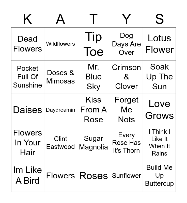 This bingo card has 30 words: Flowers, Blue Orchid, Daydreamin, Scarlet Begonias, Dead Flowers, Tip Toe, Doses & Mimosas, Sugar Magnolia, Forget Me Nots, Roses, Love Grows, Kiss From A Rose, Sunflower, Build Me Up Buttercup, Soak Up The Sun, In Bloom, Every Rose Has It's Thorn, Flowers In Your Hair, Clint Eastwood, Lotus Flower, Daises, Sunflower, Wildflowers, Crimson & Clover, Pocket Full Of Sunshine, Dog Days Are Over, I Think I Like It When It Rains, Im Like A Bird, Mr. Blue Sky and Flower Power.