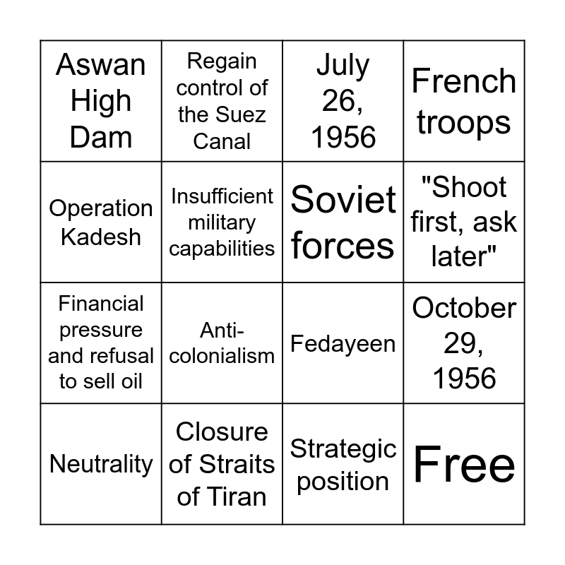 This bingo card has 17 words: Strategic position, Neutrality, July 26, 1956, Aswan High Dam, Anti-colonialism, French troops, October 29, 1956, Soviet forces, "Shoot first, ask later", Insufficient military capabilities, Closure of Straits of Tiran, Fedayeen, Operation Kadesh, Regain control of the Suez Canal, Financial pressure and refusal to sell oil, UN General Assembly Resolution 997 and Free.