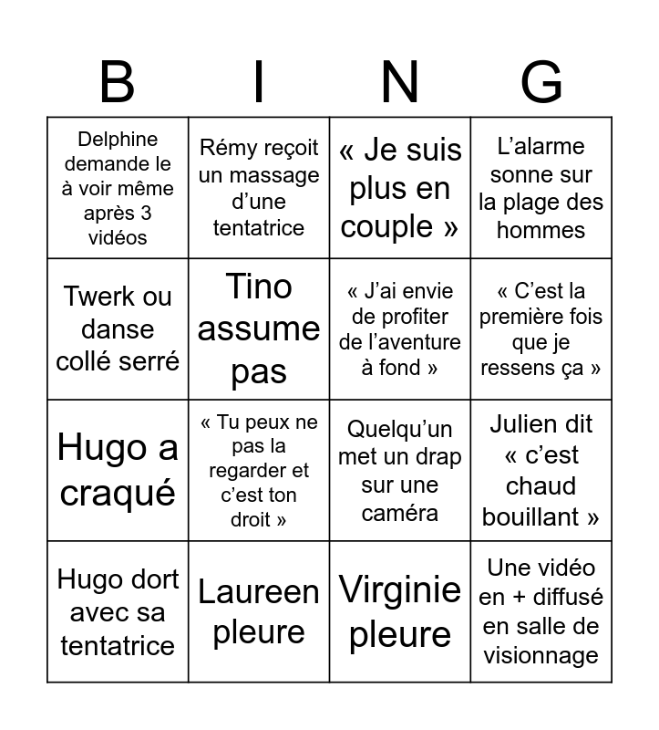 This bingo card has 16 words: Laureen pleure, Julien dit « c’est chaud bouillant », « Je suis plus en couple », Delphine demande le à voir même après 3 vidéos, Hugo a craqué, Rémy reçoit un massage d’une tentatrice, Quelqu’un met un drap sur une caméra, Virginie pleure, Twerk ou danse collé serré, Tino assume pas, Hugo dort avec sa tentatrice, L’alarme sonne sur la plage des hommes, « Tu peux ne pas la regarder et c’est ton droit », « C’est la première fois que je ressens ça », « J’ai envie de profiter de l’aventure à fond » and Une vidéo en + diffusé en salle de visionnage.