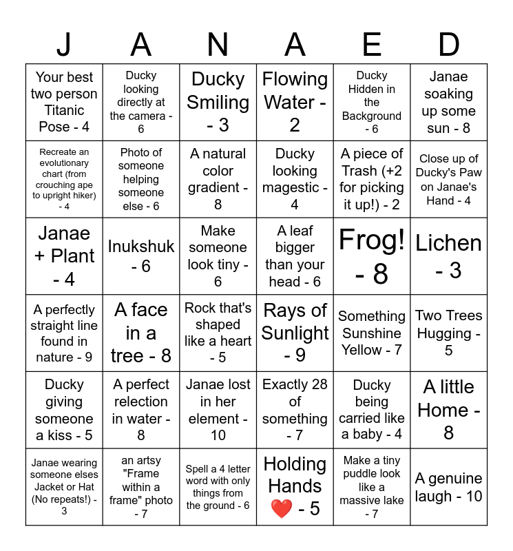 This bingo card has 45 words: Candid of Janae Laughing - 6, Janae + Plant - 4, Group selfie, (nobody looking at camera +3) - 3, Rock that's shaped like a heart - 5, Exactly 28 of something - 7, Two Trees Hugging - 5, Ducky Smiling - 3, Bird! (+3 if Janae can't identify it) - 5, Ducky Hidden in the Background - 6, Rays of Sunlight - 9, Flowing Water - 2, Inukshuk - 6, Lichen - 3, Frog! - 8, Holding Hands ❤️ - 5, Something Sunshine Yellow - 7, A little Home - 8, A piece of Trash (+2 for picking it up!) - 2, Candid of Janae looking into Nature - 4, Ducky looking magestic - 4, Ducky looking directly at the camera - 6, Janae wearing someone elses Jacket or Hat (No repeats!) - 3, Ducky being carried like a baby - 4, Your best two person Titanic Pose - 4, A wizard staff! - 3, Make someone look tiny - 6, A perfect relection in water - 8, Three different Types of moss in one photo - 4, A perfectly straight line found in nature - 9, A leaf bigger than your head - 6, Something naturally blue (No trash or clothing) - 8, A face in a tree - 8, Spell a 4 letter word with only things from the ground - 6, Make a tiny puddle look like a massive lake - 7, an artsy "Frame within a frame" photo - 7, Close up of Ducky's Paw on Janae's Hand - 4, Janae lost in her element - 10, A genuine laugh - 10, Ducky giving someone a kiss - 5, Photo of someone helping someone else - 6, Janae soaking up some sun - 8, A natural color gradient - 8, A plant or flower that is growing out of a stump - 5, Recreate an evolutionary chart (from crouching ape to upright hiker) - 4 and Someone proposing to a tree or a really nice rock. - 2.