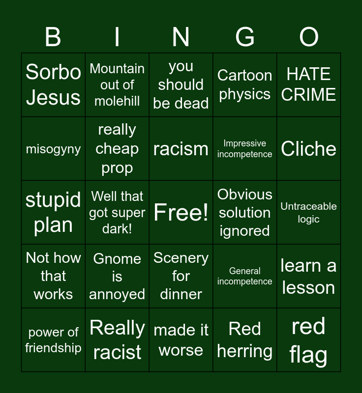 This bingo card has a free space and 26 words: Scenery for dinner, Red herring, racism, Really racist, HATE CRIME, Sorbo Jesus, misogyny, Mountain out of molehill, Untraceable logic, General incompetence, Impressive incompetence, stupid plan, learn a lesson, power of friendship, Well that got super dark!, groan inducing line, Cartoon physics, Not how that works, you should be dead, red flag, Cliche, made it worse, Obvious solution ignored, Gnome is annoyed, really cheap prop and Gnome tiptoes around TOS.