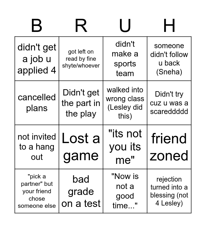 This bingo card has 16 words: bad grade on a test, friend zoned, didn't make a sports team, didn't get a job u applied 4, not invited to a hang out, got left on read by fine shyte/whoever, "its not you its me", "Now is not a good time...", cancelled plans, Didn't get the part in the play, "pick a partner" but your friend chose someone else, someone didn't follow u back (Sneha), Lost a game, Didn't try cuz u was a scareddddd, walked into wrong class (Lesley did this) and rejection turned into a blessing (not 4 Lesley).