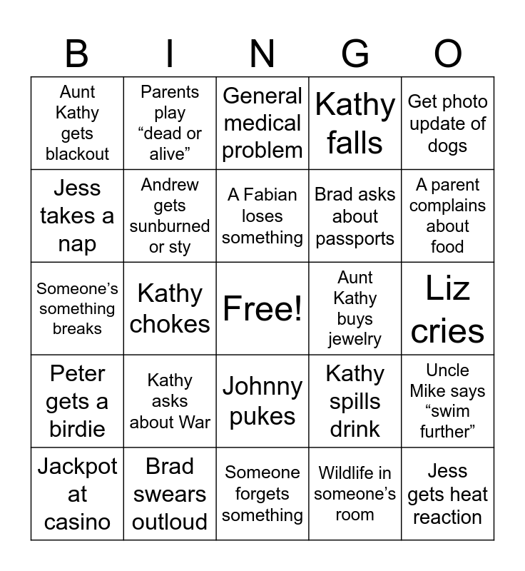 This bingo card has a free space and 24 words: Jackpot at casino, Kathy asks about War, A Fabian loses something, Wildlife in someoneās room, Get photo update of dogs, Aunt Kathy gets blackout, Parents play ādead or aliveā, General medical problem, Aunt Kathy buys jewelry, Liz cries, Someoneās something breaks, Andrew gets sunburned or sty, Kathy spills drink, Uncle Mike says āswim furtherā, Jess takes a nap, Brad swears outloud, Someone forgets something, Kathy falls, A parent complains about food, Peter gets a birdie, Kathy chokes, Johnny pukes, Brad asks about passports and Jess gets heat reaction.