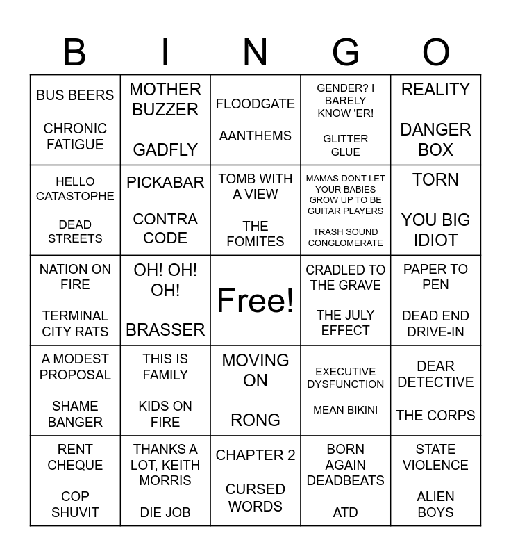 This bingo card has a free space and 24 words: THIS IS FAMILY KIDS ON FIRE, THANKS A LOT, KEITH MORRIS DIE JOB, TOMB WITH A VIEW THE FOMITES, RENT CHEQUE COP SHUVIT, REALITY DANGER BOX, BUS BEERS CHRONIC FATIGUE, HELLO CATASTOPHE DEAD STREETS, MOTHER BUZZER GADFLY, CRADLED TO THE GRAVE THE JULY EFFECT, MOVING ON RONG, MAMAS DONT LET YOUR BABIES GROW UP TO BE GUITAR PLAYERS TRASH SOUND CONGLOMERATE, NATION ON FIRE TERMINAL CITY RATS, EXECUTIVE DYSFUNCTION MEAN BIKINI, DEAR DETECTIVE THE CORPS, PICKABAR CONTRA CODE, BORN AGAIN DEADBEATS ATD, PAPER TO PEN DEAD END DRIVE-IN, FLOODGATE AANTHEMS, TORN YOU BIG IDIOT, OH! OH! OH! BRASSER, STATE VIOLENCE ALIEN BOYS, A MODEST PROPOSAL SHAME BANGER, GENDER? I BARELY KNOW 'ER! GLITTER GLUE and CHAPTER 2 CURSED WORDS.