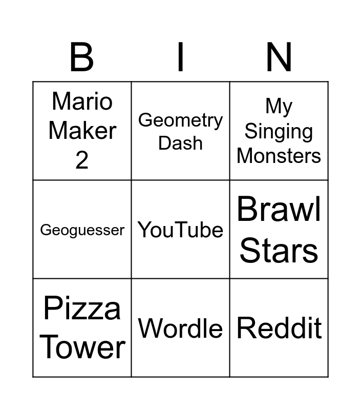 This bingo card has a free space and 8 words: Brawl Stars, My Singing Monsters, Geometry Dash, Pizza Tower, Mario Maker 2, Reddit, Geoguesser and Wordle.