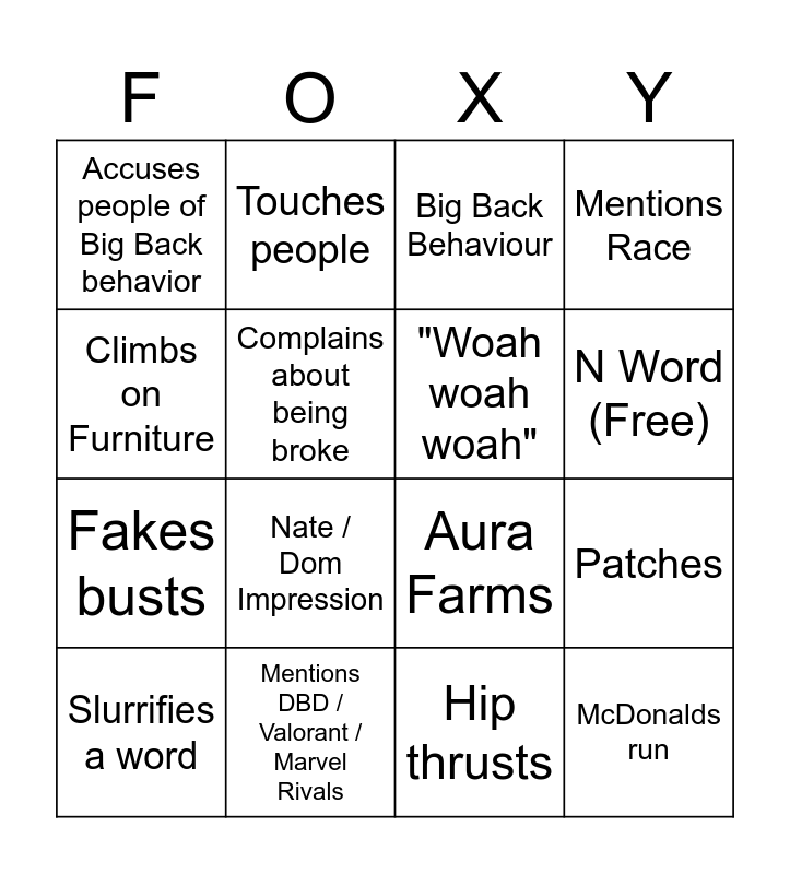 This bingo card has 18 words: Nate / Dom Impression, McDonalds run, Big Back Behaviour, Accuses people of Big Back behavior, Aura Farms, Mentions Race, Slurrifies a word, Touches people, N Word (Free), Fakes busts, Hip thrusts, Climbs on Furniture, Patches, Complains about being broke, "Woah woah woah", Clash, Mentions DBD / Valorant / Marvel Rivals and Zander Impression.