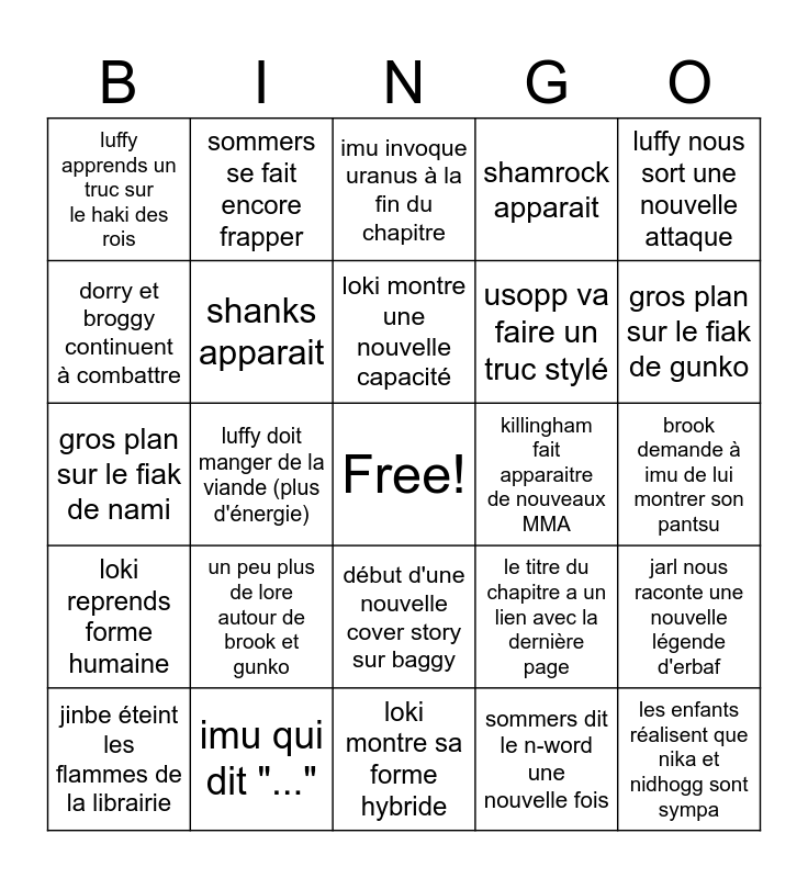 This bingo card has a free space and 24 words: un peu plus de lore autour de brook et gunko, imu qui dit "...", loki montre une nouvelle capacité, jinbe éteint les flammes de la librairie, luffy nous sort une nouvelle attaque, luffy apprends un truc sur le haki des rois, dorry et broggy continuent à combattre, sommers se fait encore frapper, killingham fait apparaitre de nouveaux MMA, début d'une nouvelle cover story sur baggy, usopp va faire un truc stylé, gros plan sur le fiak de nami, le titre du chapitre a un lien avec la dernière page, jarl nous raconte une nouvelle légende d'erbaf, shanks apparait, sommers dit le n-word une nouvelle fois, brook demande à imu de lui montrer son pantsu, imu invoque uranus à la fin du chapitre, gros plan sur le fiak de gunko, luffy doit manger de la viande (plus d'énergie), les enfants réalisent que nika et nidhogg sont sympa, loki reprends forme humaine, shamrock apparait and loki montre sa forme hybride.
