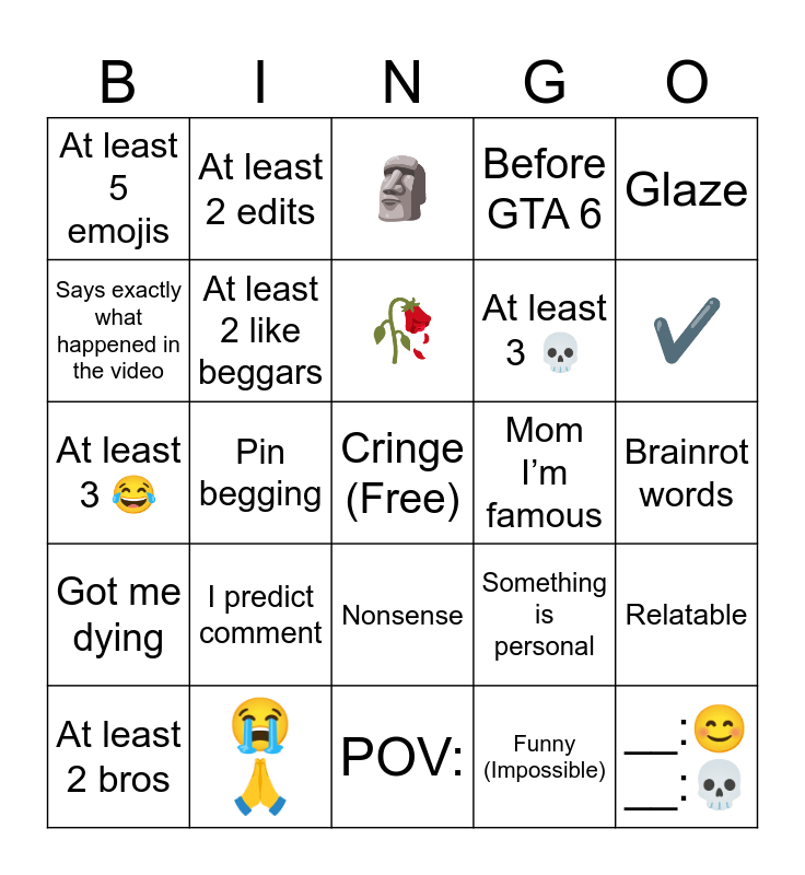 This bingo card has a free space and 24 words: I predict comment, šš, š„, At least 2 bros, Glaze, At least 5 emojis, Says exactly what happened in the video, At least 2 edits, Mom Iām famous, Nonsense, At least 3 š, At least 3 š, Something is personal, Relatable, At least 2 like beggars, Funny (Impossible), Brainrot words, šæ, āļø, Pin begging, __:š __:š, Got me dying, Before GTA 6 and POV:.