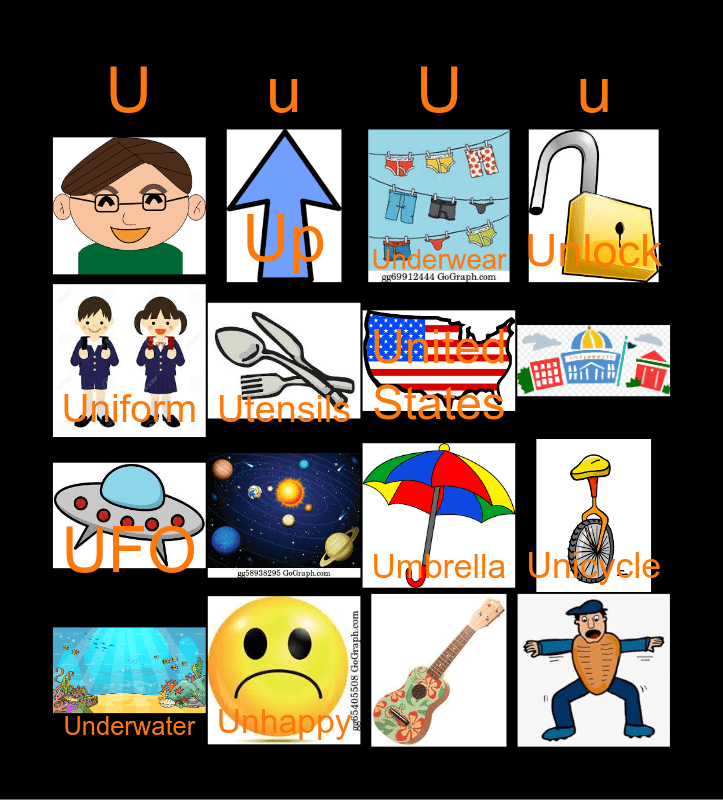 This bingo card has 19 images and 13 words: Umbrella, Unicorn, Underwear, Unicycle, Uniform, Up, UFO, Utensils, United States, Unhappy, Underwater, Unlock and Ugly.