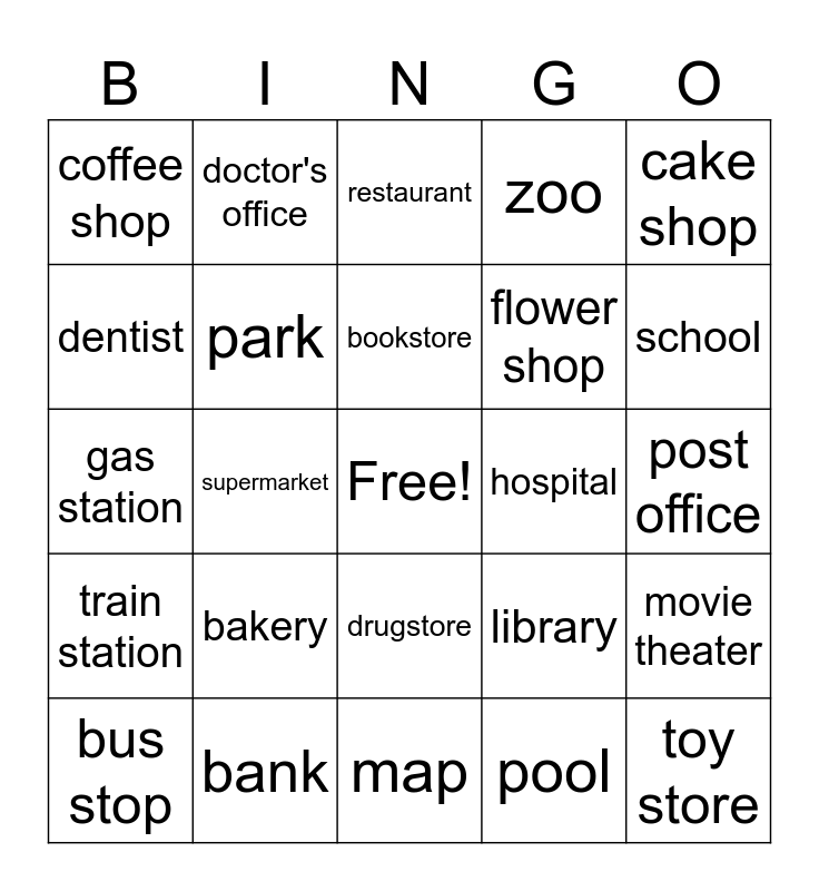 This bingo card has a free space and 24 words: bakery, bank, bookstore, bus stop, cake shop, coffee shop, dentist, doctor's office, hospital, drugstore, flower shop, gas station, library, movie theater, park, pool, post office, restaurant, school, supermarket, toy store, train station, zoo and map.