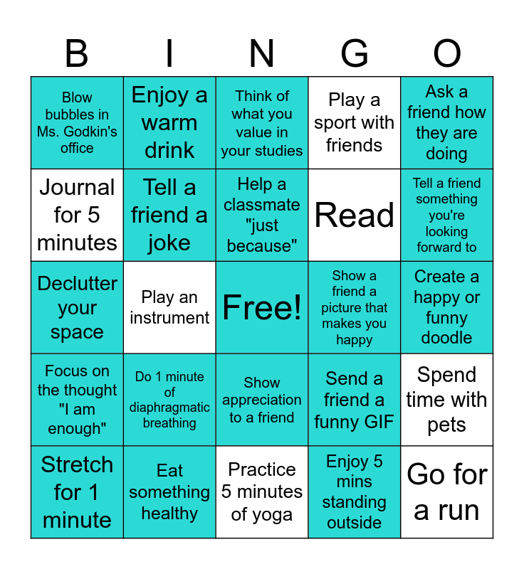 This bingo card has a free space and 34 words: Go on a walk, Enjoy 5 mins standing outside, Listen to a favorite song, Think of 3 things you're grateful for, Focus on the thought "I am enough", Tell a friend a joke, Ask a friend how they are doing, Stretch for 1 minute, Enjoy a warm drink, Savor a delicious treat/snack, Help a classmate "just because", Think of what you value in your studies, Notice how it feels to smile at someone, Give someone a compliment, Show a friend a picture that makes you happy, Tell a friend something you're looking forward to, Eat something healthy, Declutter your space, Do 1 minute of diaphragmatic breathing, Send a friend a funny GIF, Show appreciation to a friend, Enjoy a scent you love, Blow bubbles in Ms. Godkin's office, Create a happy or funny doodle, Practice 5 minutes of yoga, Go for a run, Play a sport with friends, Smell a really nice candle, Read, Journal for 5 minutes, Try something new, Play an instrument, Spend time with pets and Watch a movie.