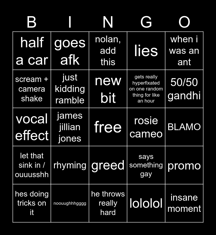 This bingo card has a free space and 29 words: hes doing tricks on it, im normal, james jillian jones, luck fuigi mention, half a car, nolan, add this, just kidding ramble, rhyming, rosie cameo, noouughhhgggg, BLAMO, insane moment, he throws really hard, lololol, 50/50 gandhi, my moms kinda homeless, greed, let that sink in / ouuusshh, when i was an ant, vocal effect, says something gay, chill guy, gets really hyperfixated on one random thing for like an hour, scream + camera shake, lies, goes afk, promo, new bit and [troll square].