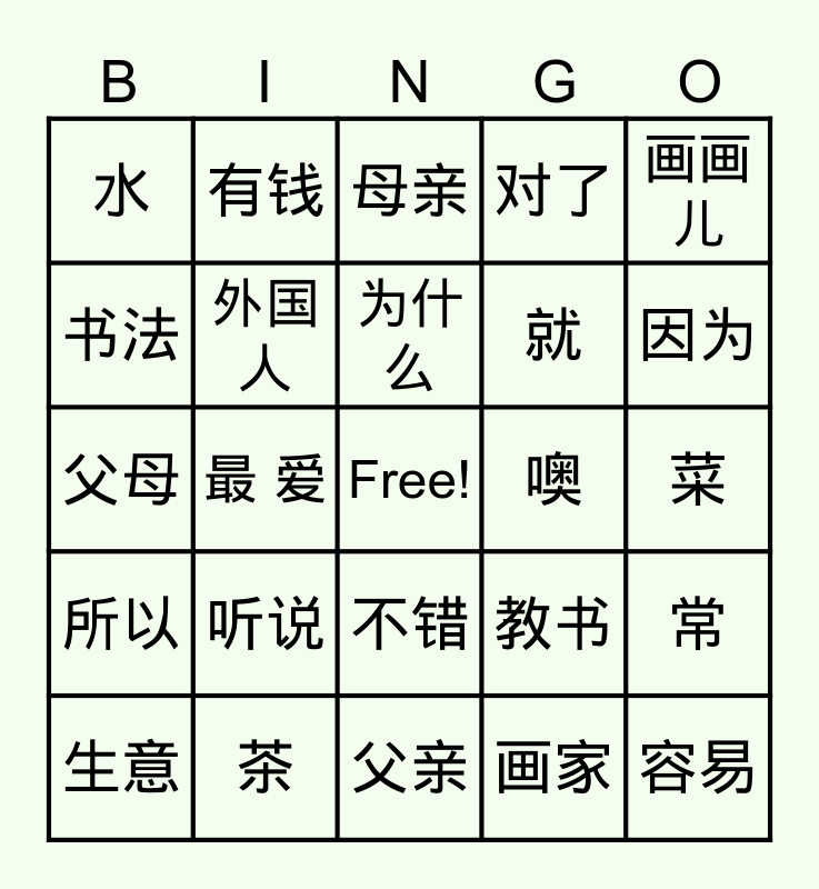 This bingo card has a free space and 28 words: 常, 一定, 就, 画家, 书法, 母亲, 有钱, 所以, 噢, 生意, 父母, 对了, 茶, 父亲, 因为, 穿衣服, 听说, 外国人, 为什么, 不错, 水, 跳舞, 容易, 最 爱, 菜, 教书, 画画儿 and 喝酒.
