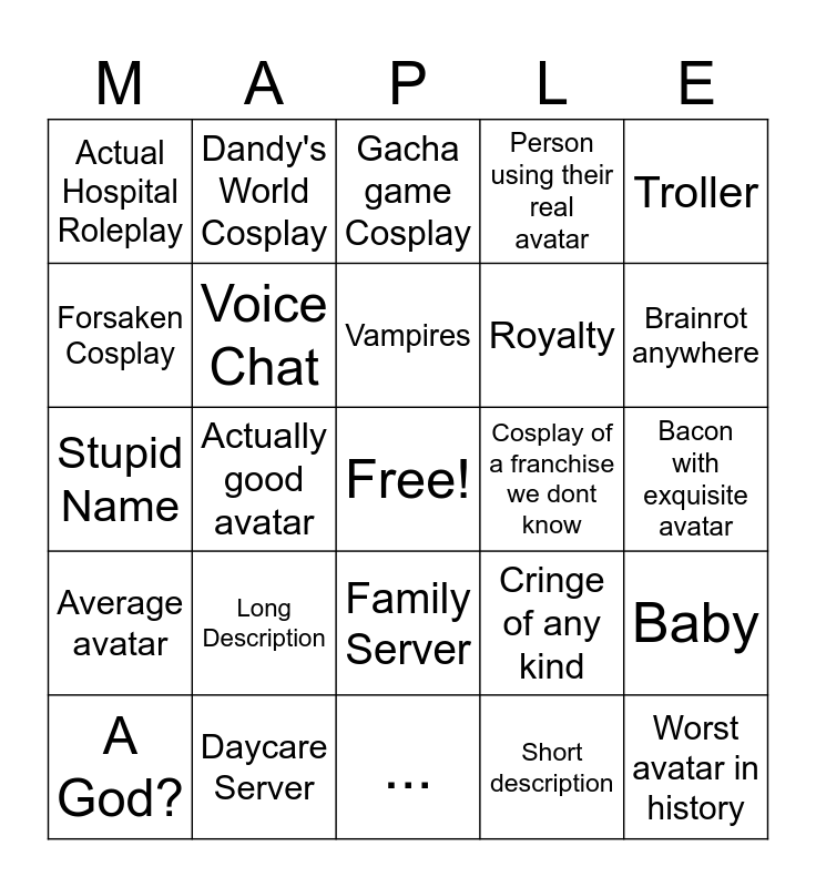 This bingo card has a free space and 24 words: Long Description, Daycare Server, Vampires, A God?, Troller, Actual Hospital Roleplay, Forsaken Cosplay, Dandy's World Cosplay, Cosplay of a franchise we dont know, Family Server, Royalty, Stupid Name, Cringe of any kind, Baby, Voice Chat, Short description, Bacon with exquisite avatar, Gacha game Cosplay, Brainrot anywhere, Actually good avatar, Worst avatar in history, Average avatar, Person using their real avatar and ....