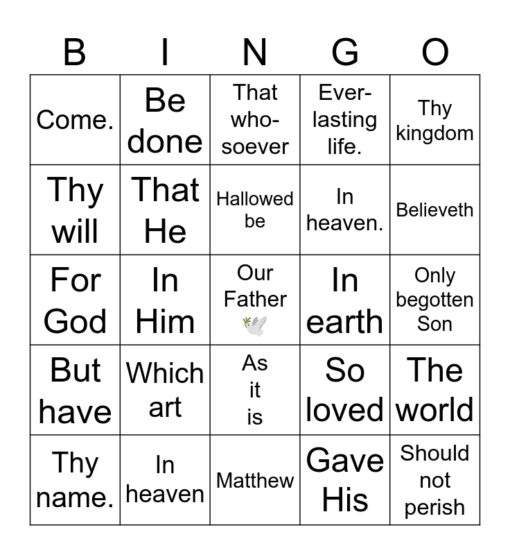 This bingo card has a free space and 24 words: Which art, In heaven, Hallowed be, Thy name., Thy kingdom, Come., Thy will, Be done, In earth, As it is, In heaven., For God, So loved, The world, That He, Gave His, Only begotten Son, That who-soever, Believeth, In Him, Should not perish, But have, Ever-lasting life. and Matthew.