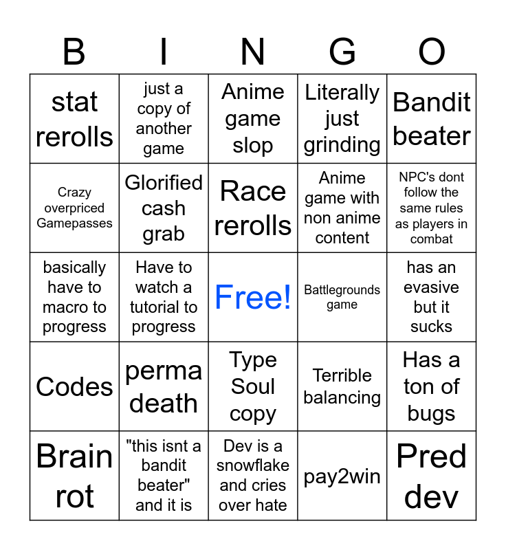 This bingo card has a free space and 45 words: Parry based combat 😐, Pred dev, No updates after release, Brain rot, skins that cost robux, pay2win, Anime game slop, tower defense game slop, Bandit beater, "this isnt a bandit beater" and it is, Literally just grinding, Battlegrounds game, Type Soul copy, perma death, rogue lineage slop, Dev is a snowflake and cries over hate, New dev team took over the game, basically have to macro to progress, AFK world, NPC's dont follow the same rules as players in combat, just a copy of another game, trait rerolls, gacha elements, stat rerolls, true 100 to 0 combos, has an evasive but it sucks, dev hates their own game, dev wants to remove core features that fans like, Terrible balancing, Codes, Akuma fighting style, Has a ton of bugs, more than 4 gamepasses on release, Has anime spoilers for no reason, Wiki game, Have to watch a tutorial to progress, Crucial details are obscure for no reason, Deepwoken wannabe, GPO character customization, Race rerolls, Crazy overpriced Gamepasses, Anime game with non anime content, Can spend robux to progress faster, Glorified cash grab and Was or is CC.