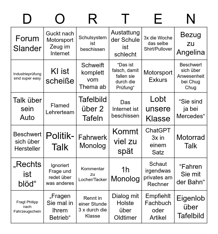 This bingo card has 36 words: Beschwert sich über Hersteller, Politik-Talk, Rennt in einer Stunde 3 x durch die Klasse, “Das ist falsch, damit fallen sie durch die Prüfung“, Lobt unsere Klasse, “Sie sind ja bei Mercedes“, Forum Slander, „Fragen Sie mal in Ihrem Betrieb“, Schulsystem ist beschissen, 1h Monolog, Motorsport Exkurs, Bezug zu Angelina, „Rechts ist blöd“, Flamed Lehrerteam, Schweift komplett vom Thema ab, Austattung der Schule ist schlecht, Schaut irgendwas privates am Rechner, Motorrad Talk, Industrieprüfung sind super easy, KI ist scheiße, Fahrwerk Monolog, Kommt viel zu spät, ChatGPT 3x in einem Satz, “Fahren Sie mit der Bahn“, Talk über sein Auto, Guckt nach Motorsport Zeug im Internet, Tafelbild über 2 Tafeln, Dialog mit Holste über Oldtimer, 3x die Woche das selbe Shirt/Pullover, Beschwert sich über Anwesenheit bei Chug Chug, Fragt Philipp nach Fahrzeugschein, Ignoriert Frage und redet über was anderes, Kommentar zu Locher/Tacker, Das Internet ist beschissen, Empfiehlt Fachbuch oder Artikel and Eigenlob über Tafelbild.