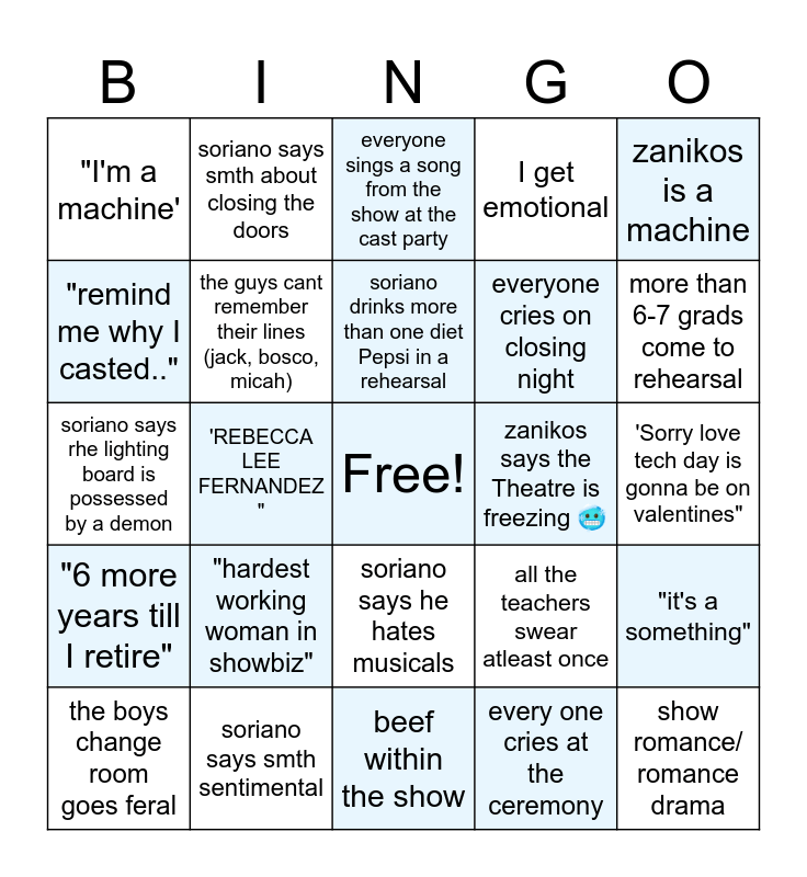 This bingo card has a free space and 24 words: "hardest working woman in showbiz", soriano says smth sentimental, soriano drinks more than one diet Pepsi in a rehearsal, the boys change room goes feral, zanikos is a machine, "I'm a machine', "remind me why I casted..", soriano says smth about closing the doors, zanikos says the Theatre is freezing 🥶, soriano says he hates musicals, everyone cries on closing night, soriano says rhe lighting board is possessed by a demon, all the teachers swear atleast once, "it's a something", the guys cant remember their lines (jack, bosco, micah), every one cries at the ceremony, 'Sorry love tech day is gonna be on valentines", everyone sings a song from the show at the cast party, more than 6-7 grads come to rehearsal, 'REBECCA LEE FERNANDEZ ", show romance/ romance drama, "6 more years till I retire", I get emotional and beef within the show.