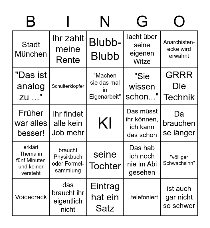 This bingo card has a free space and 24 words: braucht Physikbuch oder Formel-sammlung, das braucht ihr eigentlich nicht, "Machen sie das mal in Eigenarbeit", Voicecrack, Anarchisten-ecke wird erwähnt, Stadt München, "Das ist analog zu ...", Ihr zahlt meine Rente, Das müsst ihr können, ich kann das schon, seine Tochter, "Sie wissen schon...", Früher war alles besser!, Das hab ich noch nie im Abi gesehen, "völliger Schwachsinn", Schulterklopfer, ...telefoniert, Da brauchen se länger, Blubb-Blubb, GRRR Die Technik, ihr findet alle kein Job mehr, ist auch gar nicht so schwer, erklärt Thema in fünf Minuten und keiner versteht, lacht über seine eigenen Witze and Eintrag hat ein Satz.